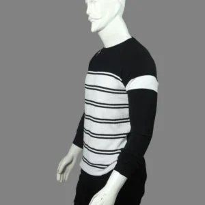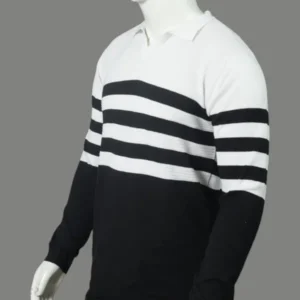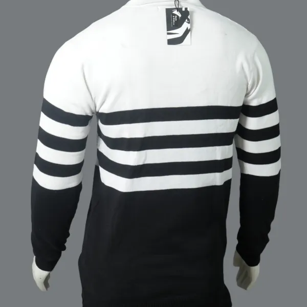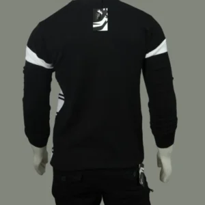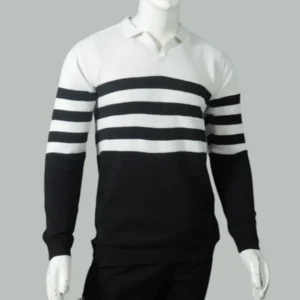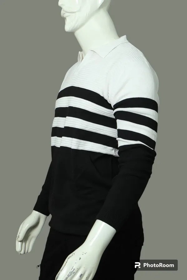 The White Trendy Premium Striped Sweatshirt features a distinctive half-black, half-white color-block design that makes a powerful visual statement. Three bold black stripes run down the sleeves, creating a sporty yet sophisticated aesthetic that transitions seamlessly from casual to polished settings.
